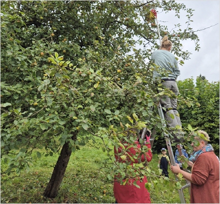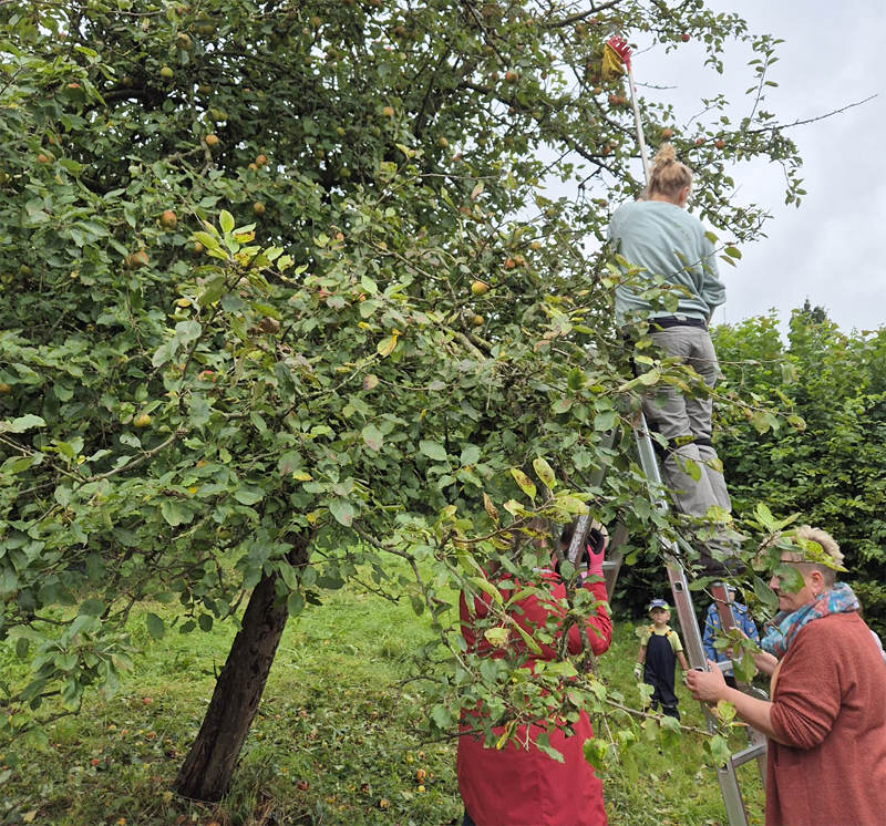 Zusammen mit den Kita Betreuerinnen und Vertreterinnen des Fördervereins pflückten die Kita-Kinder die Äpfel und Birnen.