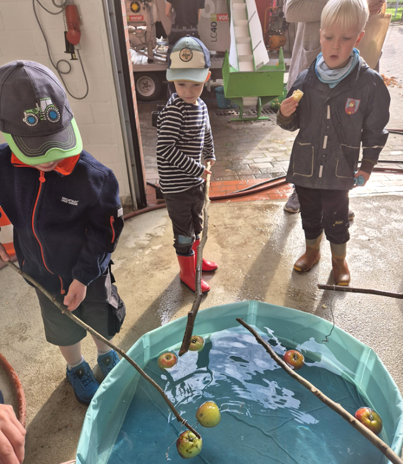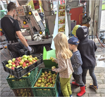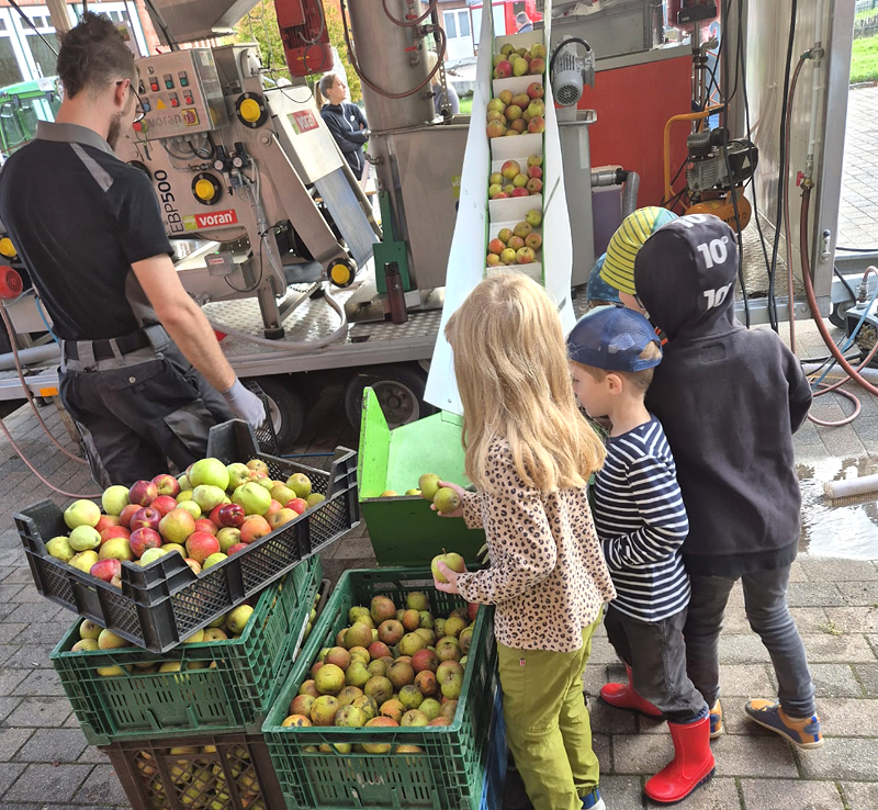 Am Freitagmorgen wanderten die "Lütten Lüüd" der Nindorfer Kita zur Streuobstwiese der Gemeinde am Lostweg. Zusammen mit den Kita Betreuerinnen und Vertreterinnen des Fördervereins wurden die Äpfel und Birnen gepflückt, aufgesammelt und auf Michaelas Anhänger gepackt. Am nächsten Tag fuhr Michaela diesen früchtebeladenen Anhänger zur mobilen Mosterei. Die Apfelsaftpresse von Juicers aus Gokels stand am 20. September auf dem Dörpshuus-Platz in Nindorf. Alle Kinder halfen tüchtig mit, die vielen Äpfel und Birnen in Saft umzuwandeln 105 Liter Apfelsaft kamen am Ende zusammen. 35 drei Liter Boxen stehen dem Förderverein "Lütte Nindörper" nun zur Verfügung.