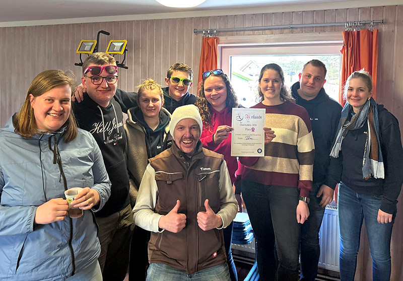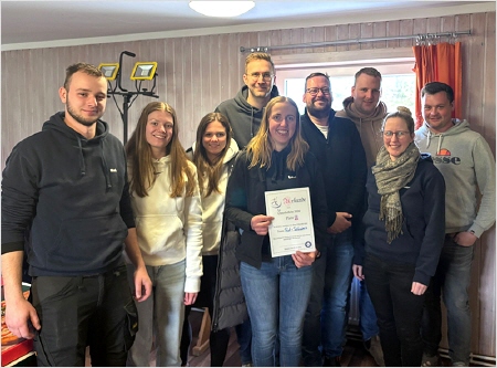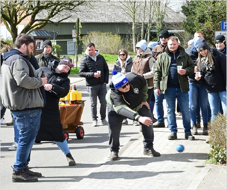 Es war sonnig aber ziemlich frisch, als sich der Boßeltrupp gegen 13 Uhr in Bewegung setzte. Optimal ausgerüstet mit Bollerwagen, Boßelkugeln und Marschverpflegung starteten die 4 Mannschaften. 35 Teilnehmer/innen nahmen an diesem Nachmittagsvergnügen teil. Ziel des Boßelns war es, mit möglichst wenigen Würfen die Kugel über die festgelegte Strecke zu werfen. Am Ende stand das Team "Rot" ganz oben auf dem Treppchen. Mit gleich vielen Würfen wurden die Mannschaften "Rot-Schwarz" und "Blau-Schwarz" zweiter. Am meisten Würfe brauchte das Team "Blau" für die Strecke.