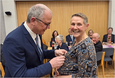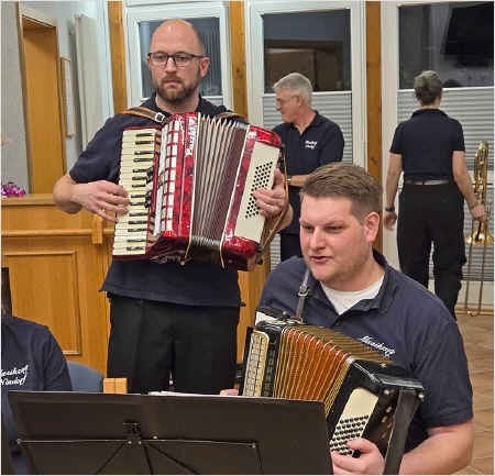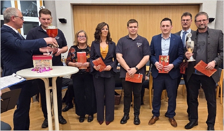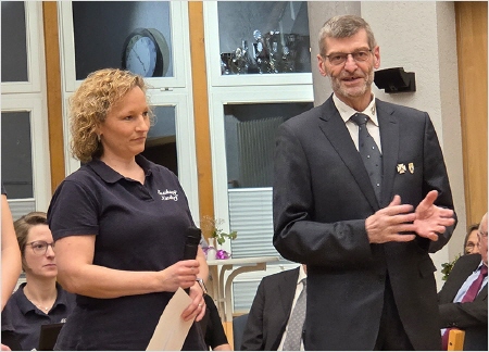 Ehrungen standen weiterhin auf dem Programm. 15 Jahre im Musikzug sind Yuliya Sommer und Insa Trede, 25 Jahre dabei sind Nele Gerdt und Dennis Rohwer. Ihnen wurde die silberne Ehrennadel angesteckt. Bereits 50 Jahre Kyffhäuser Kameraden sind Jens Rohwer und Dietmar Karwat. Ihnen wurde die Kyffhäuser-Ehrennadel in Gold angesteckt. Außerdem nutzte der Vorsitzende Dietmar Karwat den offiziellen Rahmen, um die Schützen und Schützinnen zu ehren, die im Jahre 2025 bei den Bundesmeisterschaften glänzten. Den zweiten Platz beim Einzelschießen der Frauen belegte Jutta Sievers. Petra Horns wurde dritte. Ganz oben auf dem Treppchen stand Maik Wiekhorst beim Bundeswettbewerb in der Einzelwertung auf dem Podest. Und wie schon etliche Jahre zuvor gewann die Mannschaft der Senioren mit Dietmar Karwat, Helmut Bünz und Boto Wittgrefe die Bundesmeisterschaft.