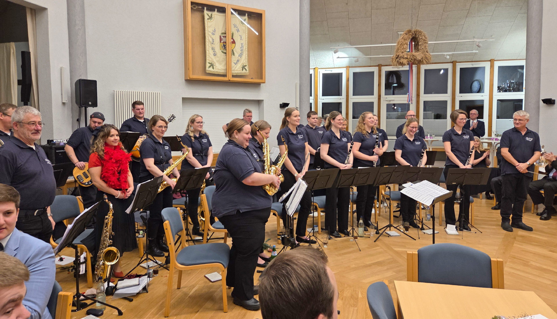 Der Vorsitzende der Nindorfer Kyffhäuser Dietmar Karwat und die Vorsitzende des Musikzugs Christina Schulz begrüßten die erschienenen Gäste. Bereits am Vorabend beim Winterkonzert, ebenfall im Dörpshuus, präsentierte der Musikzug das neueste Programm vor ausverkauftem Haus. Mit dem San Carlo Marsch eröffnete der Musikzug sein einstündiges Konzert an diesem Abend. Zwischendurch wurden die Musikstücke humorvoll von unterschiedlichen Musikern und Musikerinnen angesagt. Der Musikzug, unter der Leitung von Nils Olsen begeisterte mit einer bunten Mischung aus Pop, Musicals, Filmmusik und Schlagern und am Ende durfte auch die Zugabe nicht fehlen.