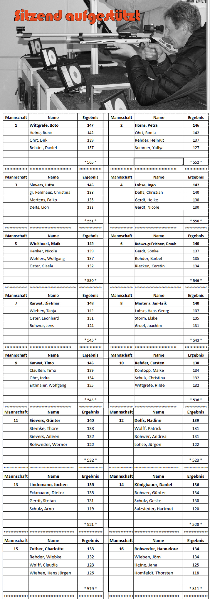 Beim "Sitzend aufgestützt" gewann die Mannschaft mit Boto Wittgrefe (147 Ringe), René Heine (142), Dirk Ohrt (139) und Daniel Rehder (137). Schützenkönige wurden Dietmar Karwat mit 148 Ringen im Sitzend aufgestützt und René Heine mit 149 Ringen im Stehend aufgelegt.