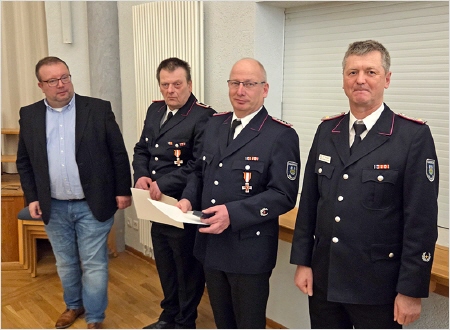 Eine gravierte Uhr von der Gemeinde gab es für 30 Jahre aktiven Dienst für Jochen Lindemann, Sönke Gerdt, Ingo Lohse und Dirk Ohrt.