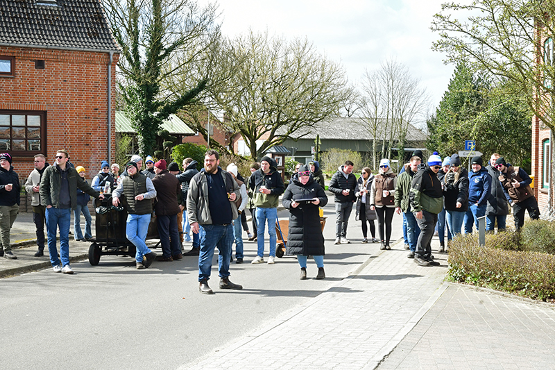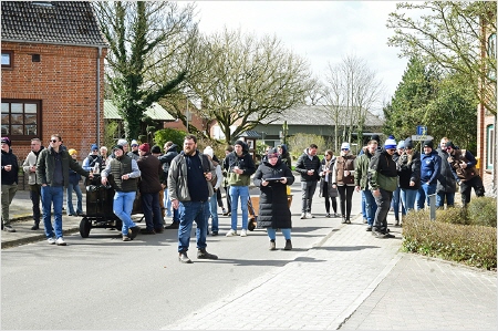 Es war sonnig aber ziemlich frisch, als sich der Boßeltrupp gegen 13 Uhr in Bewegung setzte. Optimal ausgerüstet mit Bollerwagen, Boßelkugeln und Marschverpflegung starteten die 4 Mannschaften. 35 Teilnehmer/innen nahmen an diesem Nachmittagsvergnügen teil. Ziel des Boßelns war es, mit möglichst wenigen Würfen die Kugel über die festgelegte Strecke zu werfen. Am Ende stand das Team "Rot" ganz oben auf dem Treppchen. Mit gleich vielen Würfen wurden die Mannschaften "Rot-Schwarz" und "Blau-Schwarz" zweiter. Am meisten Würfe brauchte das Team "Blau" für die Strecke.