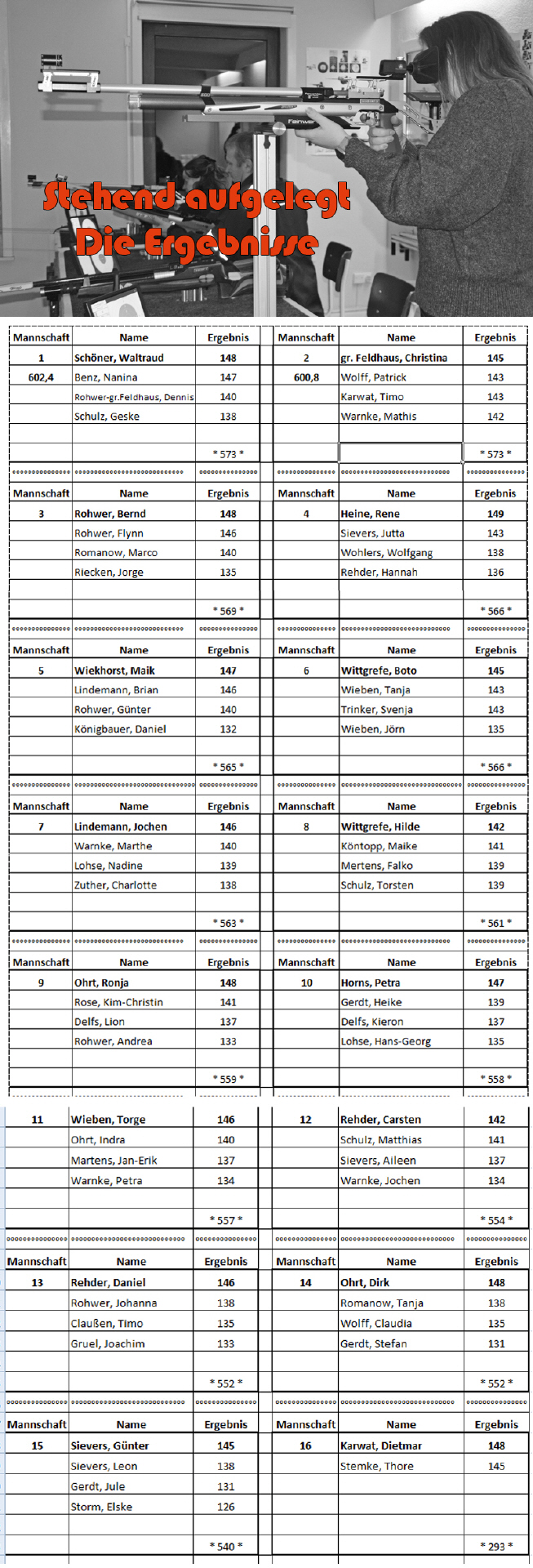 Beim "Sitzend aufgestützt" gewann die Mannschaft mit Boto Wittgrefe (147 Ringe), René Heine (142), Dirk Ohrt (139) und Daniel Rehder (137). Schützenkönige wurden Dietmar Karwat mit 148 Ringen im Sitzend aufgestützt und René Heine mit 149 Ringen im Stehend aufgelegt.